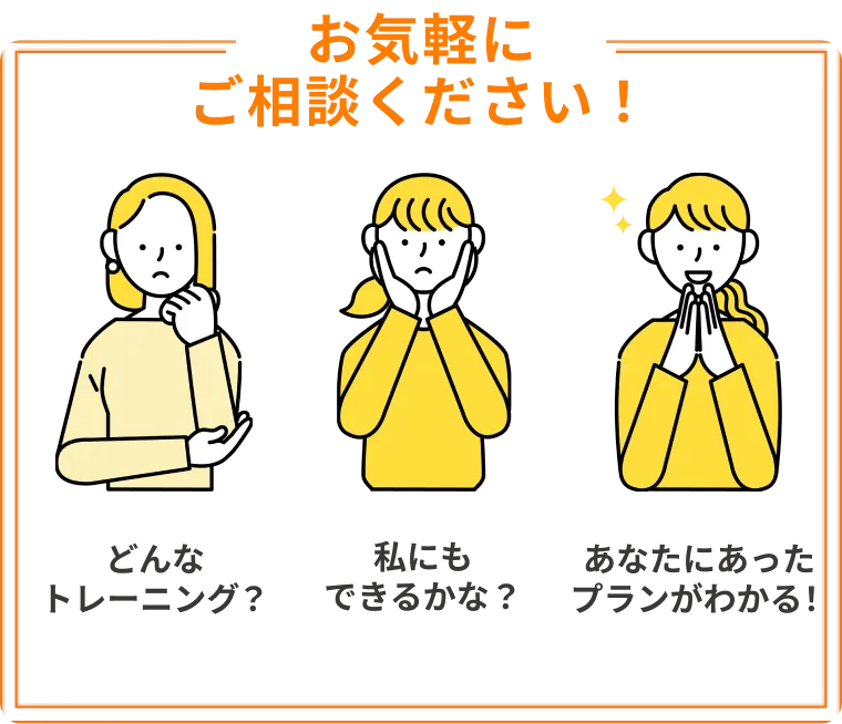 お客様の目的やご要望をスタッフが丁寧にカウンセリングを行い、トレーニングはお客様の体力やその日の体調に合わせて無理なく進めていきますので、ご安心ください。