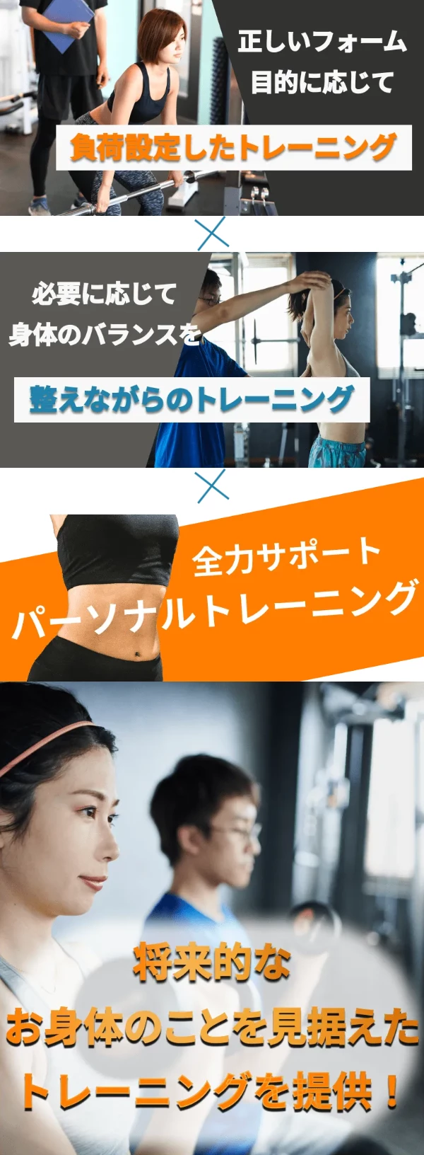 「筋力増量」「運動不足やストレスの解消」「関節痛の改善」「健康診断の数値改善」など様々な目的に合わせてトレーニングを行うことが可能です。